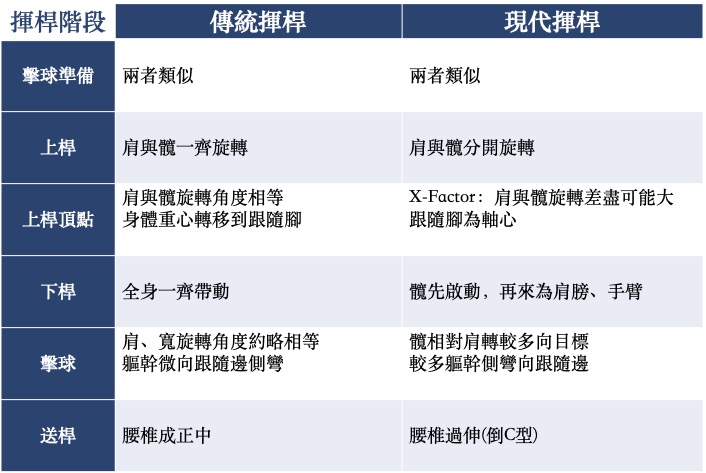兩者最主要的差異在於肩與髖的旋轉角度差,現代揮桿著重在利用X-Factor、X-Factor Stretch,以及臗與骨盆的啟動,來產生較大的桿頭速度。這是因為X-Factor stretch運用了牽張縮短循環來讓軀幹、腹部的肌肉在瞬間離心收縮後,達到更大的向心收縮。